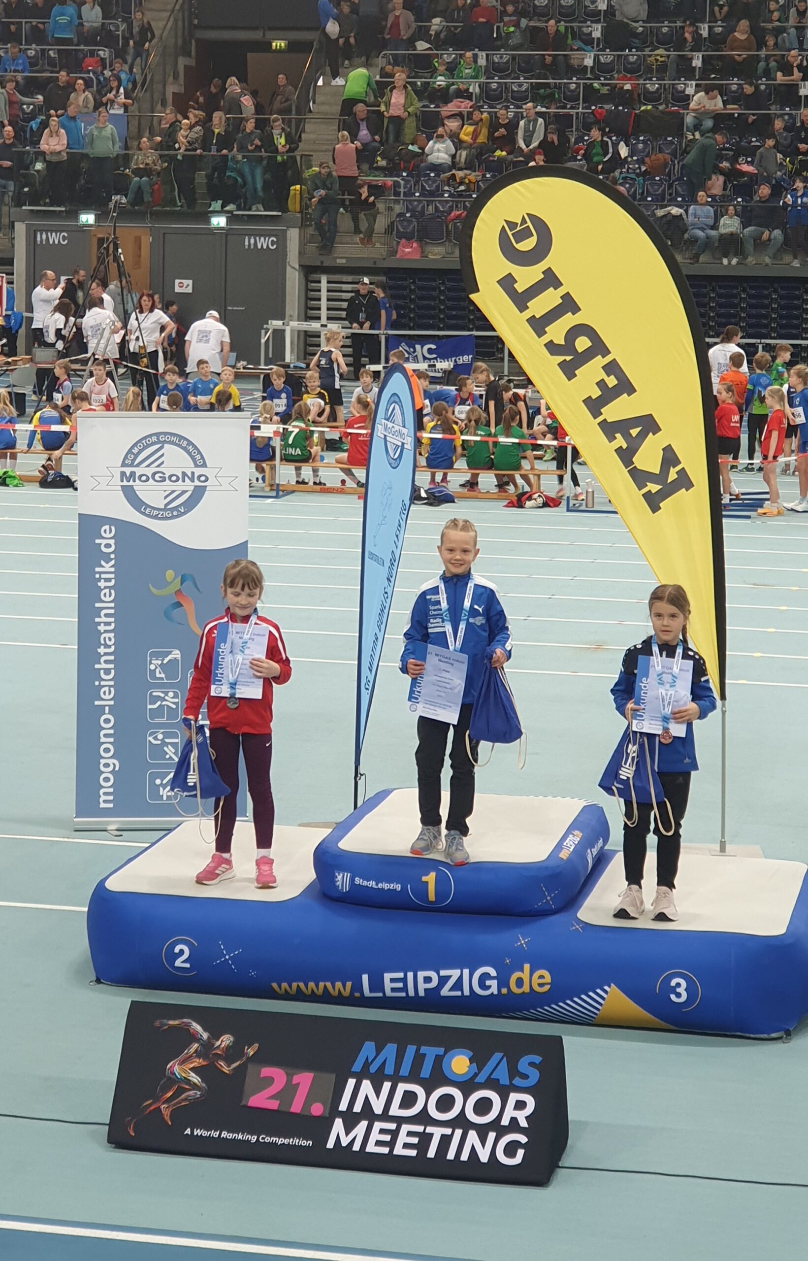 Von unserer Abteilung wollten sich 3 der jüngsten Mädchen der Herausforderung stellen. Aufgrund der hohen Meldezahlen wurde das Anmeldeportal eher geschlossen. Da sieht man das Interesse, sogar wenn es in Sachsen-Anhalt und Sachsen auf ein Ferienwochenende fiel. Unsere jüngste Luna Murawa (W7) fand sich schnell in der großen Halle zurecht. Sie startete Ihren Tag mit guten 2,27m im Weitsprung(7.Platz) und Platz 5 im unbekannten Medizinballstoßen. Im abschließenden 400m Lauf drehte Luna dann so richtig auf und rannte in der Spitzengruppe mit. Erst auf den letzten 50m musste Sie die Konkurrenz ziehen lassen und erreichte einen starken, aber unglücklichen 4. Platz. Nele Hermann (W8) war von Anfang an hellwach und zeigte konzentrierte Sprünge im Weitsprungfeld der W8. Zunächst war die Stimmung bei 2,98m etwas gedämpft – da die 3m nicht zu knacken waren – aber dann bedeutete dies den 3. Platz in der Konkurrenz. So konnte Nele eine schöne Siegerehrung mit Medaille und kleinem Sachpreis in der großen Arena genießen. Über die 50m legte sie noch einen guten 5. Platz nach. Hannah Hermann (W9) traf in Ihrer Altersklasse auf ein Feld von bis zu 40 Kindern. Im Weitsprung bedeuteten ihre 3,08m dabei einen guten 7. Platz. Für den Sprint war Hannah sehr motiviert und gewann Ihren Zeitlauf in 8,67s. Aber bei 6 Zeitläufen stand im Endklassement ein solider 5. Platz, welcher Hannah aber nicht erfreuen konnte. Mit ihrer Zeit aus dem November hätte eine Medaille gewunken.