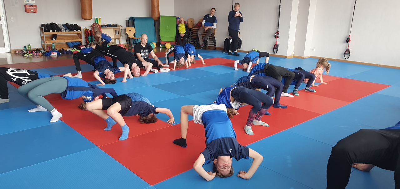 So reisten auch dieses Jahr 48 Abteilungsmitglieder im Alter von 6 Monaten bis 87 Jahren am Gründonnerstag in die Altmark. In schönen, modernen und hellen Doppel- und Dreibettzimmern fand jeder sein Bett und dann begann das Trainingslager am Abendbrotbuffet. Danach ging es in die Geräteturnhalle, wo sich vor allem die Kinder in der Schaumstoffgruppe, auf den Minitramps oder der Weichbodenmatte ausprobieren und Saltos schlagen konnten.
