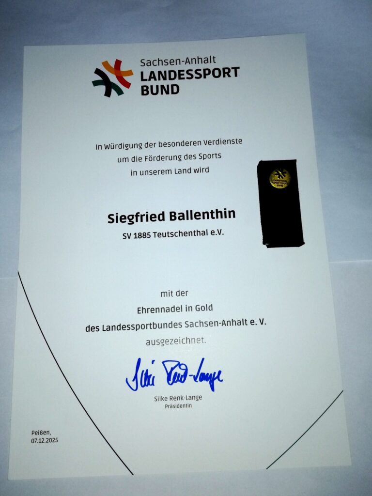 Dieses Jahr wurde unserem Abteilungsleiter Siegfried Ballenthin für seine unermüdliche Arbeit im Hintergrund der Abteilung Leichtathletik die Ehrennadel in Gold vom Landessportbund Sachsen-Anhalt e.V. verliehen.